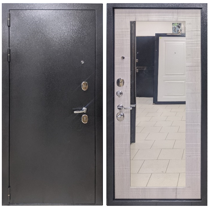 Мет-МДФ 2050/860-960 R/L Тип открывания Наружное Отделка снаружи Порошково-полимерное Цвет нар. покрытия Антик серебро Отделка внутри МДФ 10 мм. Зеркало Цвет вн. покрытия Дуб Галифакс Грей Толщина полотна 92 мм. Утепление полотна Базальтовая плита Контуры уплотнения 3 шт. ППУ 302 Тип короба Открытого типа Наличник Металл. Г-образной формы 70мм Петли 3 шт. на подшипниках Глубина короба 105 мм Основной замок Галеон 3 серии, цилиндровый Дополнит. замок Галеон 3 серии, сувальдный Тип ручки Ручка раздельная 0593 Ночная задвижка В комплекте Цилиндр Цил.мех.: к-в перфокарта: Эксцентрик для регулировки прижима Глазок В комплекте - металл/панель зеркало
